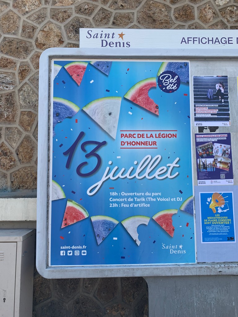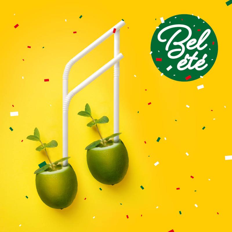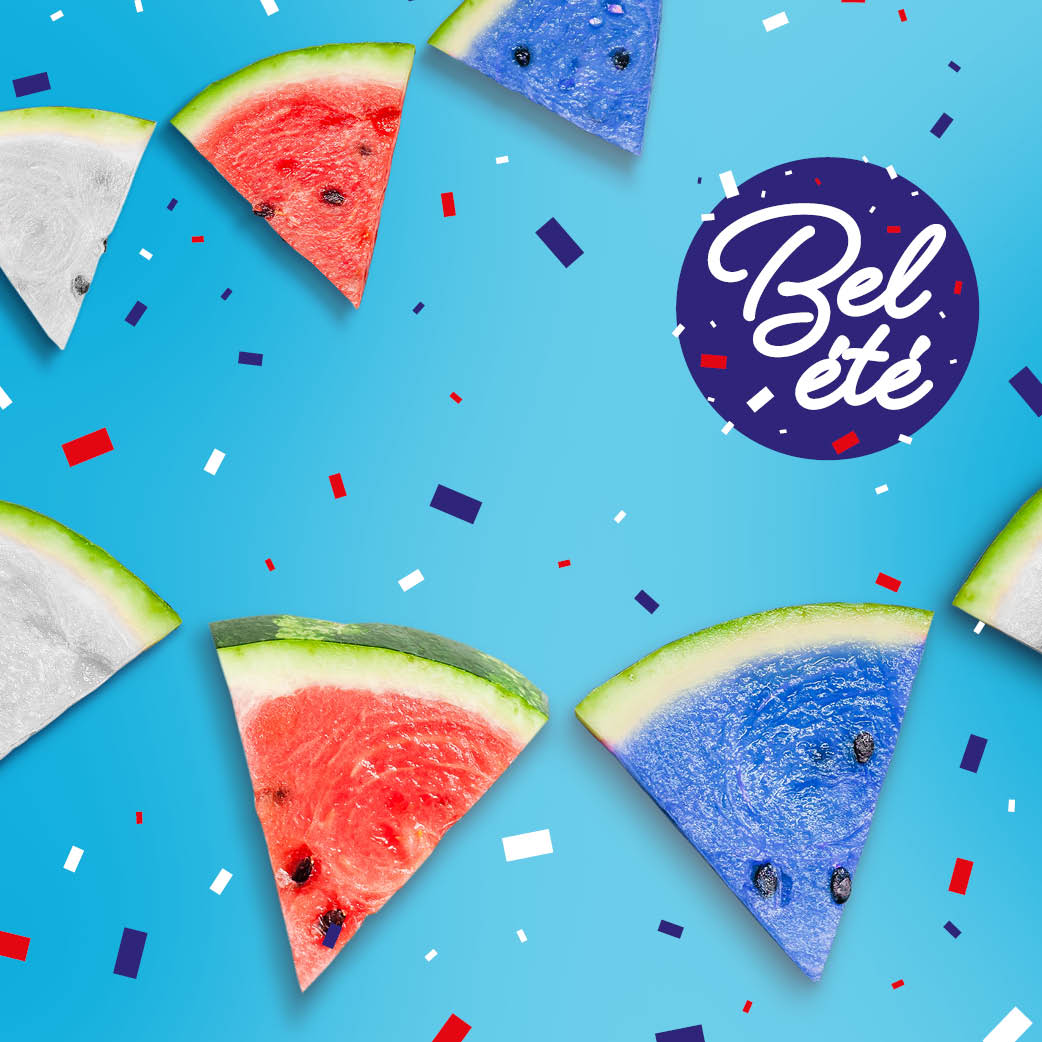 L’idée pour cette communication était de reprendre les fanions de guinguette et tricolores pour symboliser la fête nationale en continuant à jouer avec un objet symbolisant l’été : la pastèque. Le cartouche Bel été inscrit ces supports de communication dans la communication globale de Bel été, avec la reprise des cotillons.