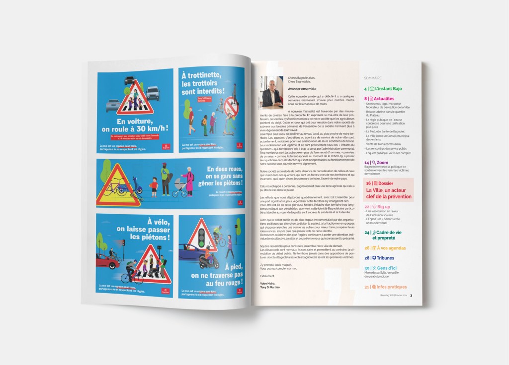 Avec l’arrivée de la nouvelle identité graphique (nouveau logo, nouvelles identités graphiques pour les différentes thématiques d’affiches, communication générique de la ville, etc.), j’ai appliqué cette refonte graphique au journal de la Ville.