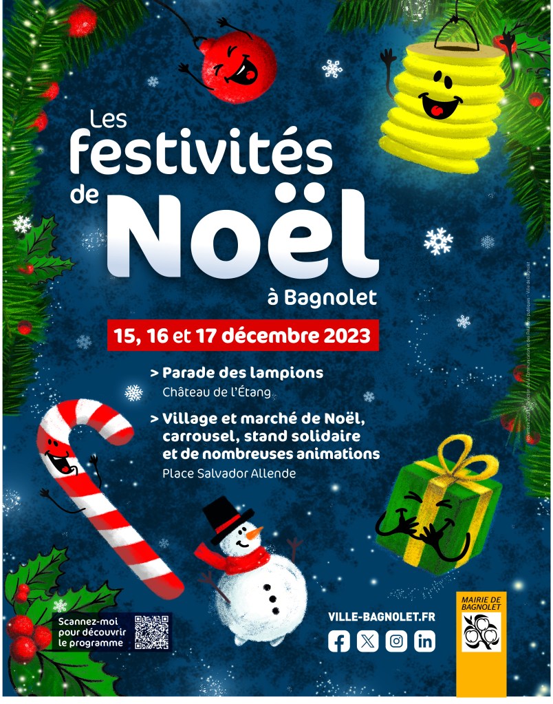 Pour cette communication, j’ai décidé de dessiner des personnages typiques de Noël : cadeau, boule de sapin, bonbon, bonhomme de neige et lampion qui est le symbole de l’évènement d’ouverture des Festivités de Noël de Bagnolet avec la descente aux lampions.